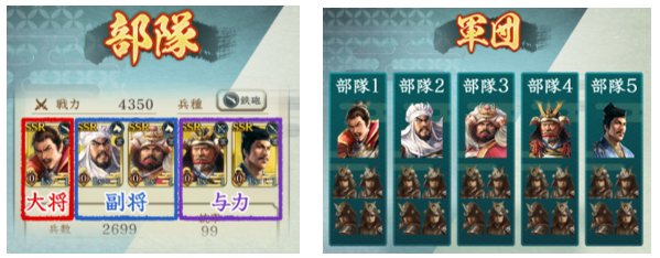 「編成」では、最大5名の武将を登録する「部隊」と、5つの部隊で作る「軍団」があります。