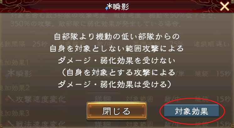 LR夏侯惇の戦法「妙才射穿」の詳細画面にある「瞬影」の詳細ボタン(※画像1)を押し、「瞬影」の詳細画面右下の「対象効果」(※画像2)を押す