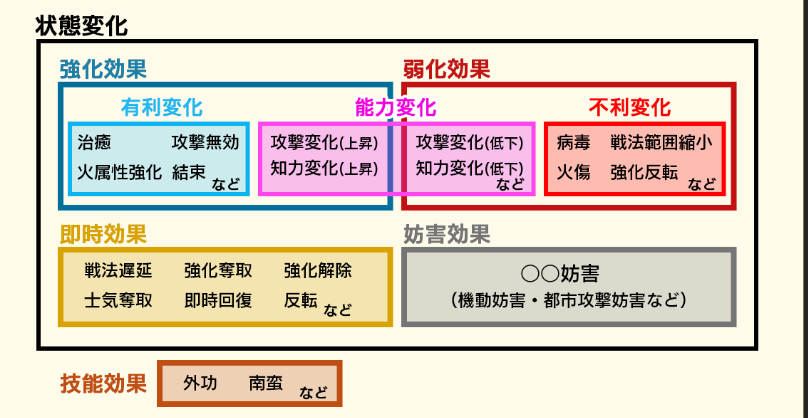 状態変化の種類には、「有利変化」、「不利変化」、「即時効果」、「能力変化」がありますが、各状態変化にどのような効果が属しているかについては、